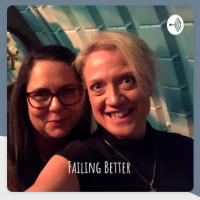 image description: a selfie featuring Leila with dark hair and glasses, and Caroline with blond hair, both in black tops – the words Failing Better written across the image in small white font.