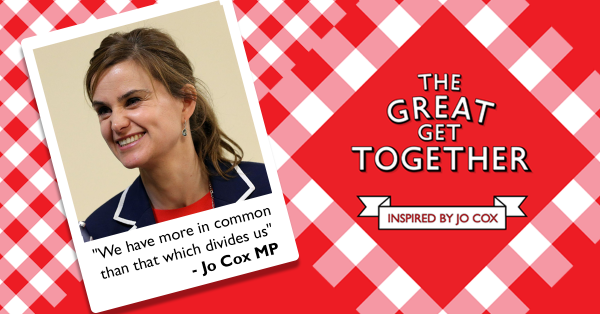image description: red tablecloth header with the words ‘The Great Get Together inspired by Jo Cox’ in white writing on the right hand side, and on the left, a polaroid headshot of a smiling white woman with brown hair, above the quote “We have more in common than that which divides us’ – Jo Cox MP